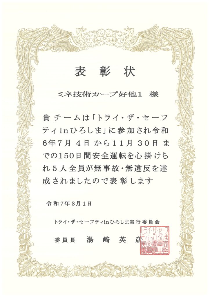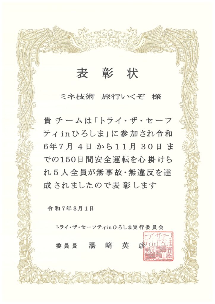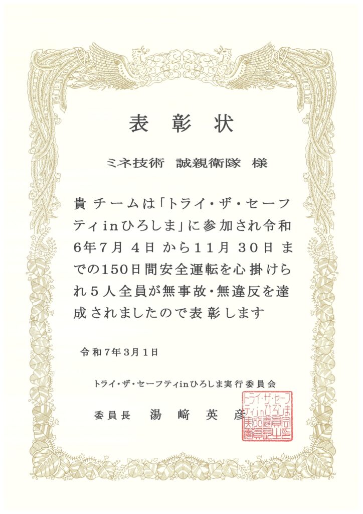 従業員の交通安全に対する意識づけの一環として、毎年「トライ・ザ・セーフティ in ひろしま」に積極的に参加し、無事故無違反を目指しています。